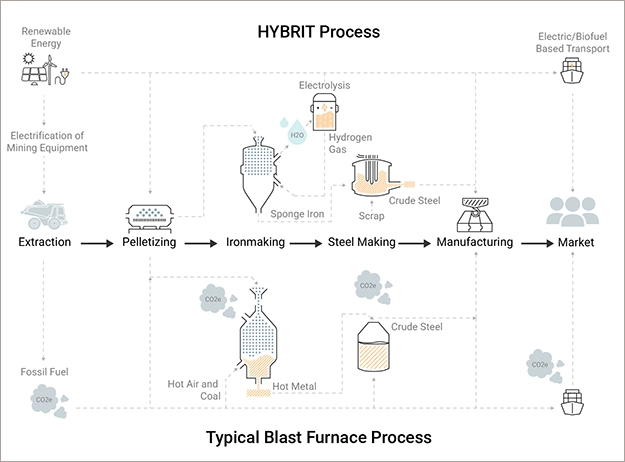 Swedish steelmaker SSAB has developed the Hydrogen Breakthrough Ironmaking Technology (HYBRIT). Instead of using fossil fuels, hydrogen is split from water via electrolysis to heat the steel in a blast furnace, creating "sponge iron" with no greenhouse gas emissions. This is mixed with scrap metal before forming slabs for use.