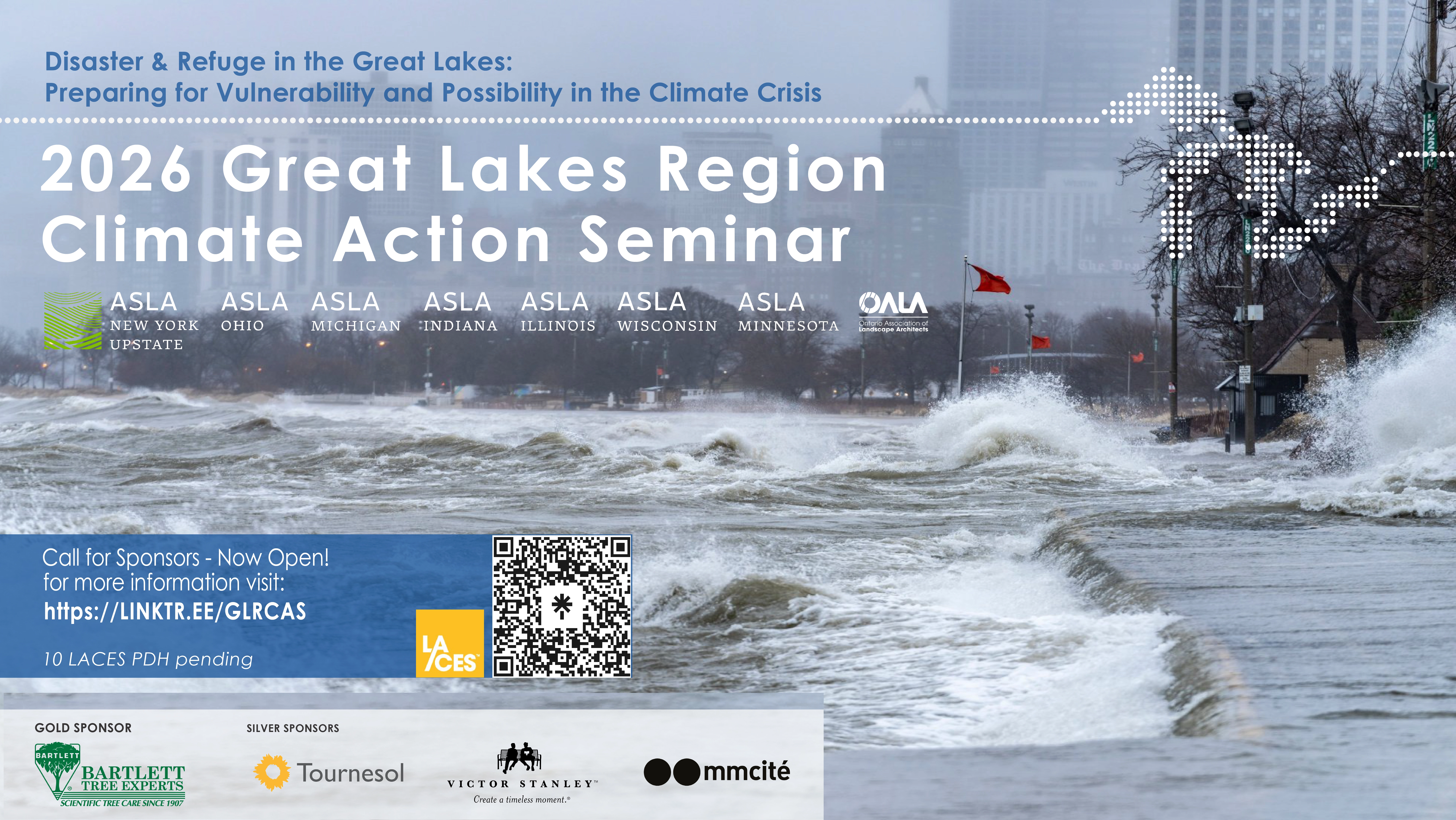The ASLA State Chapters for Upstate New York, Ohio, Michigan, Indiana, Illinois, Wisconsin, and Minnesota, along with the Ontario Association of Landscape Architects, invite you to attend the 2026 Great Lakes Region Climate Action Seminar. This event in the regional series continues to explore and expand landscape architecture’s role in addressing climate change impacts across urban and natural systems in the Great Lakes Region.