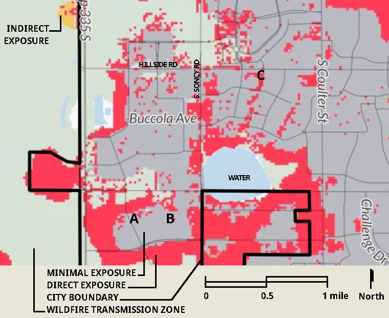 It reveals primary and secondary exposure areas, ‘little-to-no exposure’ and fireshed, with fine detail for ember sources. An ephemeral playa lake is noted accurately as it is most often dry or only partly damp. GIS data does not replace site visits, but more detail clarifies differences between source of risk and severity for locations A, B, and C. Site owners can be informed as they choose how much to invest in fire resistance—the most warranted for site A, and possibly less for site C than for site B.