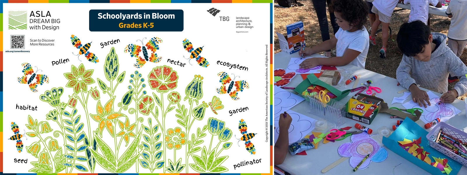 The Schoolyards in Bloom: Exploring Pollinators Through Landscape Architecture poster is an interdisciplinary, hands-on learning resource designed to introduce students to pollinators, environmental literacy, and landscape architecture through art, science, and design activities. Its primary target audience is teachers, informal educators, families, and caregivers working with grades K-5, with parallel extensions for middle school students (grades 6-8). Sponsored by TBG, content for the poster project was written by committee member Taylor Metz, ASLA, PLA, and designed by National ASLA. The poster provides grade-specific lesson plans aligned with STEM goals and Next Generation Science Standards (NGSS) standards, along with interactive classroom and outdoor activities, vocabulary development, and coordinated design projects, such as creating pollinator gardens or murals.