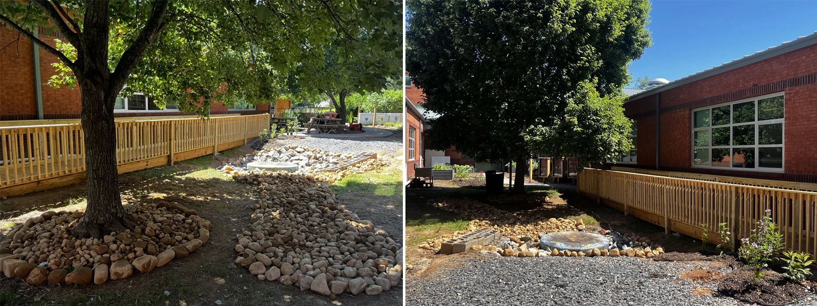 Last year at Parkside Elementary, in partnership with Takeda, Brooke Freeman, ASLA, and her organization (Out Teach) helped design a dry riverbed and rain garden system that slows, spreads, and makes stormwater visible, allowing students to see how water moves and shapes the land after a storm. Building on that work, they are currently developing a Takeda-supported project featuring a segmented vegetated swale system that works with the site’s slope, creating a series of visible moments where runoff is slowed, cooled, and filtered while also serving as a learning tool for understanding ecological infrastructure!