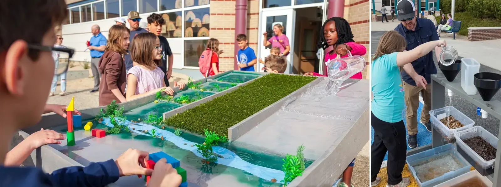 Water Play Activities: These hands-on activities help students explore how water moves through landscapes by pouring water through funnels filled with different materials, such as synthetic turf, gravel, sand, and permeable pavers, and predicting which will drain the fastest. A second activity demonstrates how water flows down a slope and how different surface materials affect runoff and the impacts on areas at the base of the slope.
